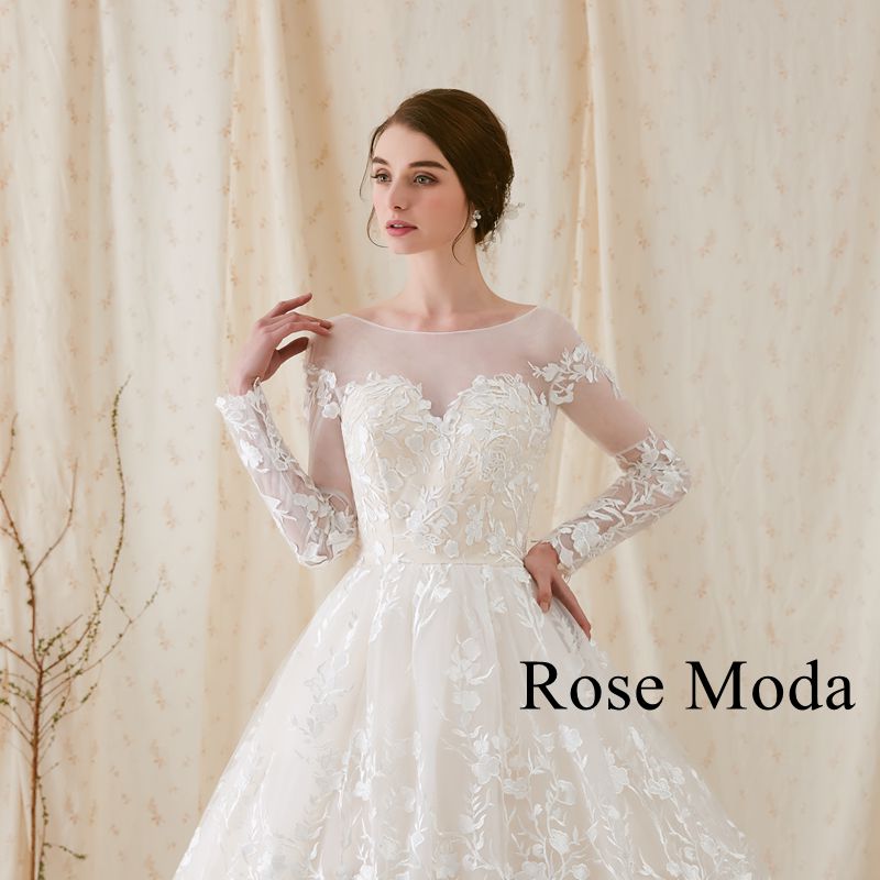 Rosemoda ball gown wedding dress with long sleeve, ivory illusion bateau neckline, low cut V at back, champagne satin lining, cascading lace skirt, natural waist, chapel train.