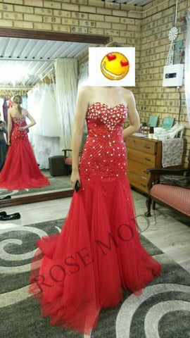 Sweetheart neckline with strapless, heavy hand beadwork, red beading with transparent crystal, mermaid prom dress, accept custom made.